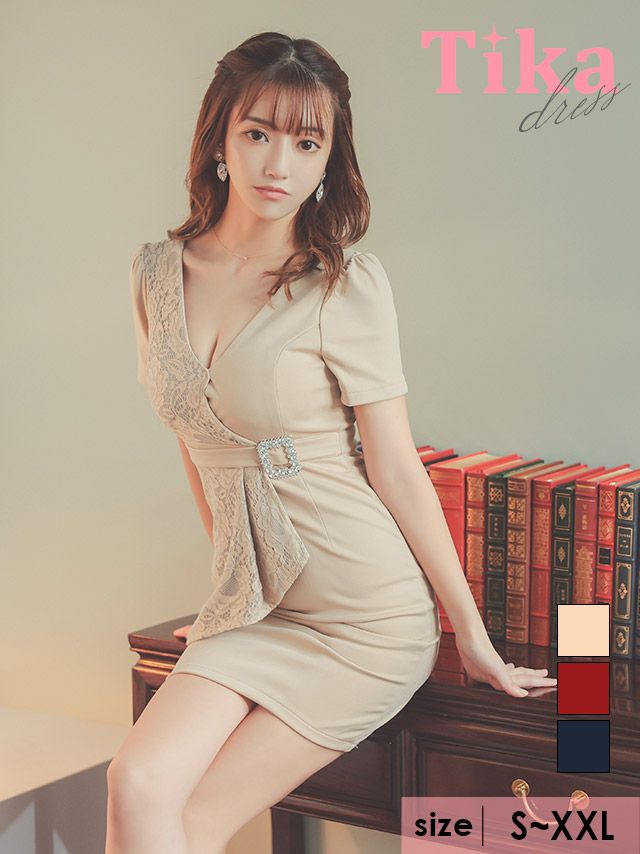 キャバドレス ミニ丈 大きいサイズ 体型カバー 袖あり Tika ティカ 半袖Vネックビジューベルト付きアシメレースペプラムタイトミニドレス