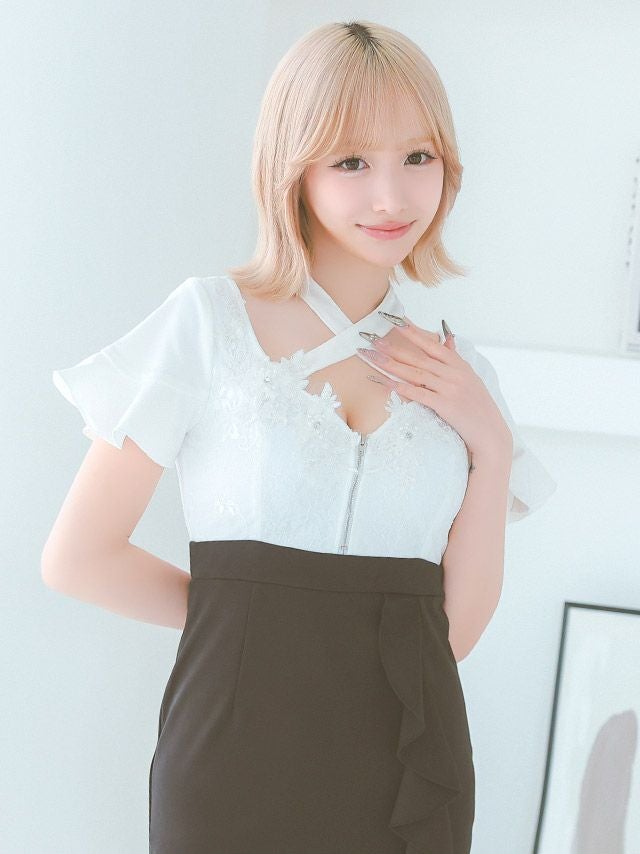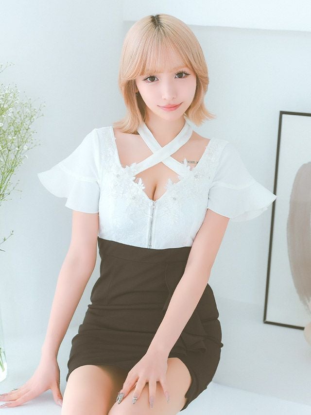 5. 立体フラワー 刺繍 バストジップデザイン クロスネック 半袖 バイカラー ストレッチ タイトミニドレス (Sサイズ~XXLサイズ) (重川茉弥/キャバドレス着用)
