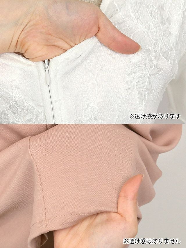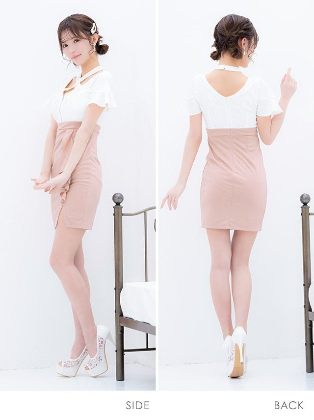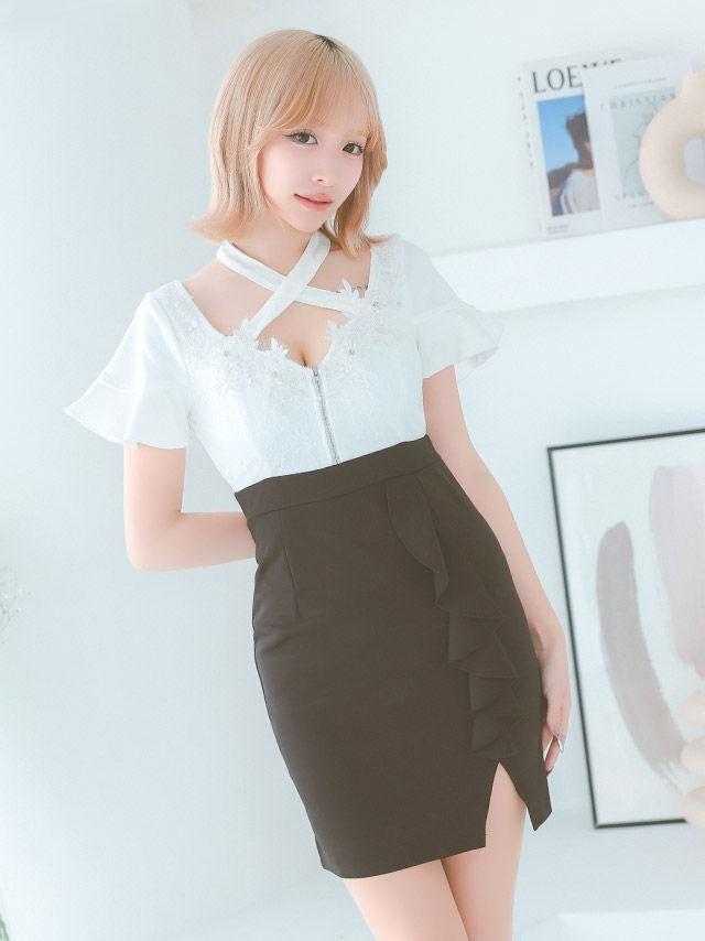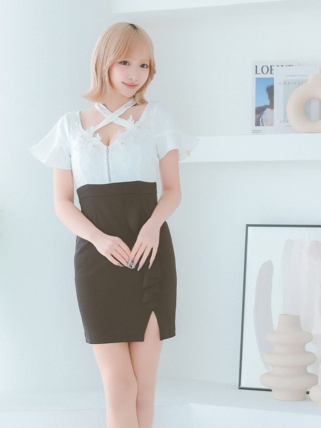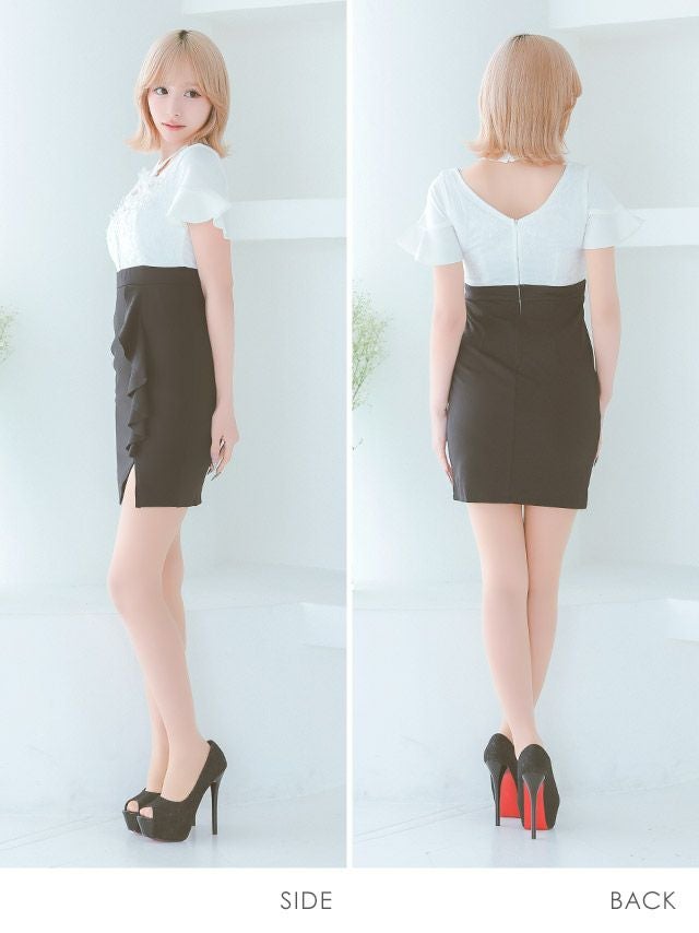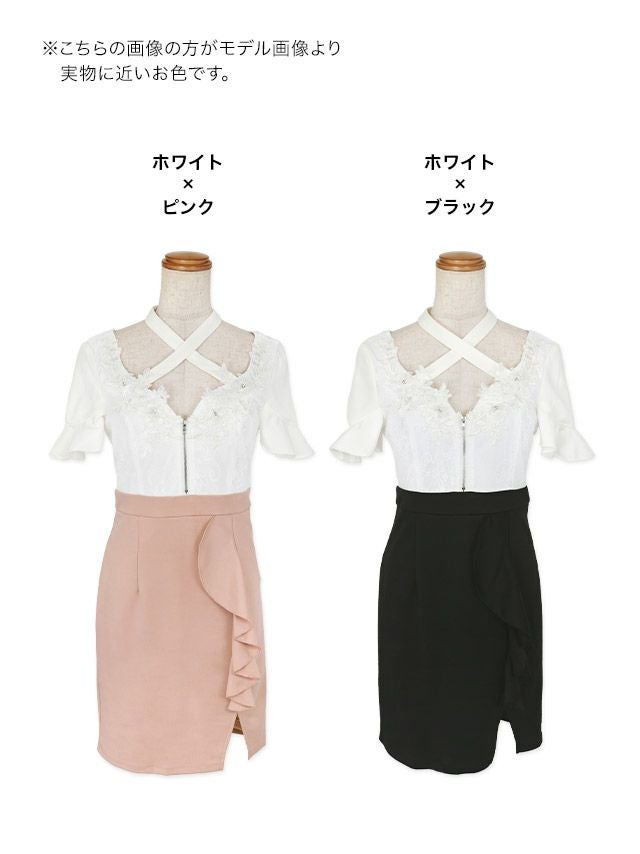 フリル袖立体フラワー刺繍バストシッパーデザインクロスネック半袖スリットバイカラータイトミニドレスのカラーバリエーション