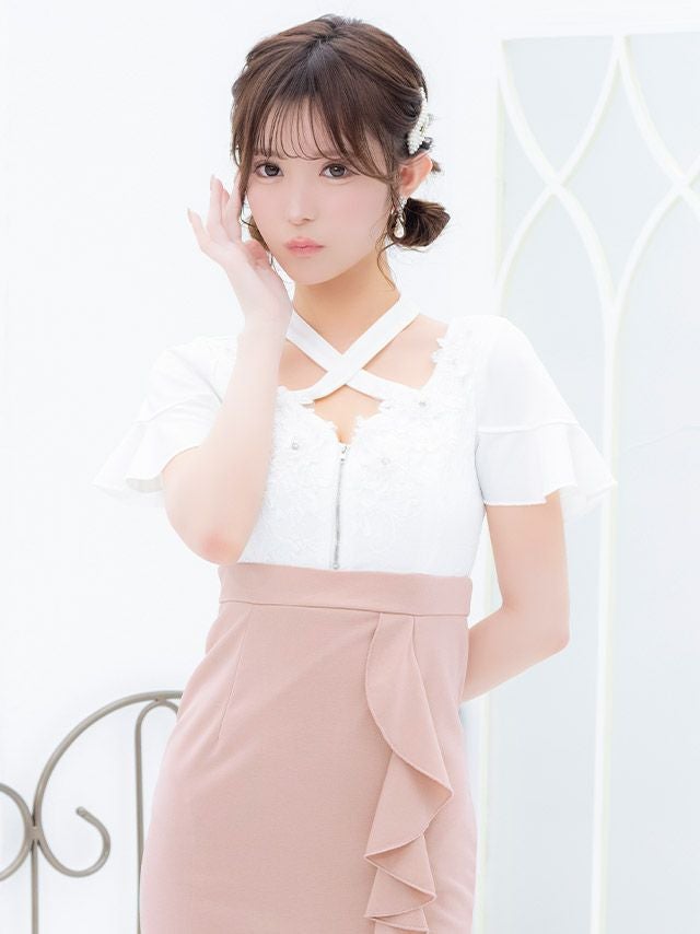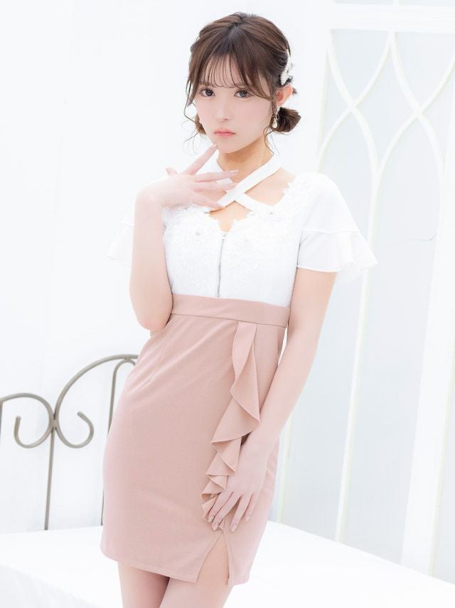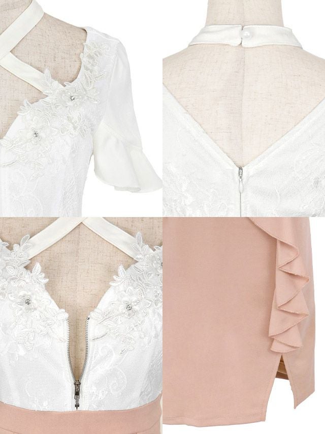 キャバドレス ミニ丈 大きいサイズ キャバクラ クラブ ラウンジ Tika ティカ フリル袖立体フラワー刺繍バストシッパーデザインクロスネック半袖スリットバイカラータイトミニドレス