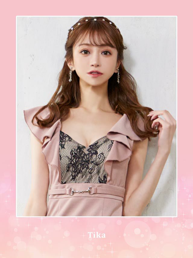 キャバドレス ミニ丈 大きいサイズ キャバクラ クラブ Tika ティカ ウエストマークベルト付きブラックフラワーレース切り替えゴージャスフリル袖ストレッチタイトミニドレス