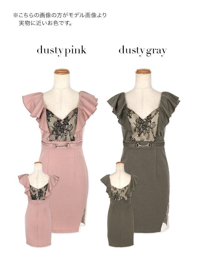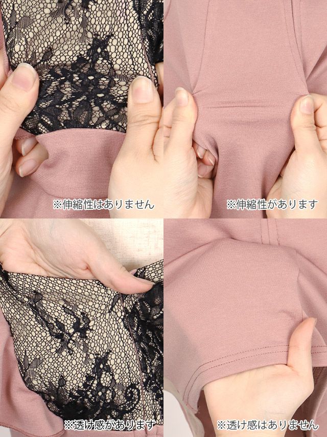 ウエストマークベルト付きブラックフラワーレース切り替えゴージャスフリル袖ストレッチタイトミニドレスのカラーバリエーション