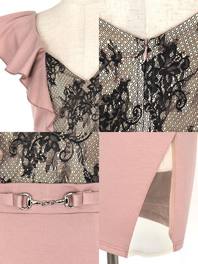 ウエストマークベルト付きブラックフラワーレース切り替えゴージャスフリル袖ストレッチタイトミニドレスの商品詳細1