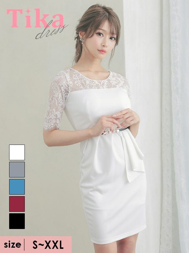 4. ベルト付き袖ありレース切替アシメペプラム風ワンカラータイトミニドレス (Sサイズ~XXLサイズ) (聖菜/キャバドレス着用)
