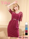 3. ベルト付き袖ありレース切替アシメペプラム風ワンカラータイトミニドレス (Sサイズ~XXLサイズ) (聖菜/キャバドレス着用)
