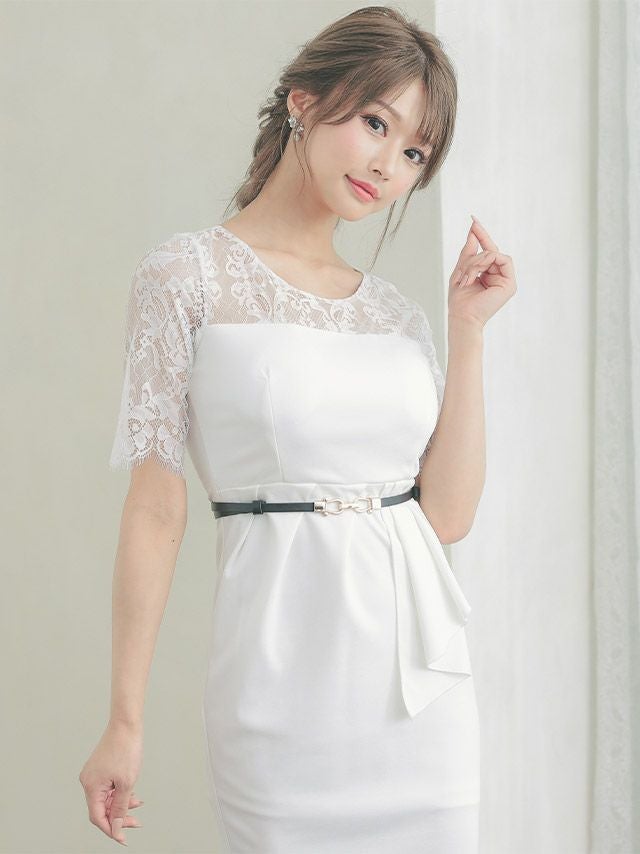 4. 袖ありフラワレースベルト付きドレープペプラム風ワンカラータイトミニドレス (Sサイズ~XXLサイズ) (戦慄かなの/キャバドレス着用)