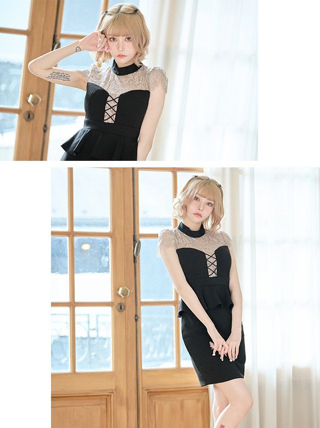 5. ハイネック半袖レース切り替えバストクロスペプラムストレッチタイトミニドレス (Sサイズ~Lサイズ) (戦慄かなの/キャバドレス着用)