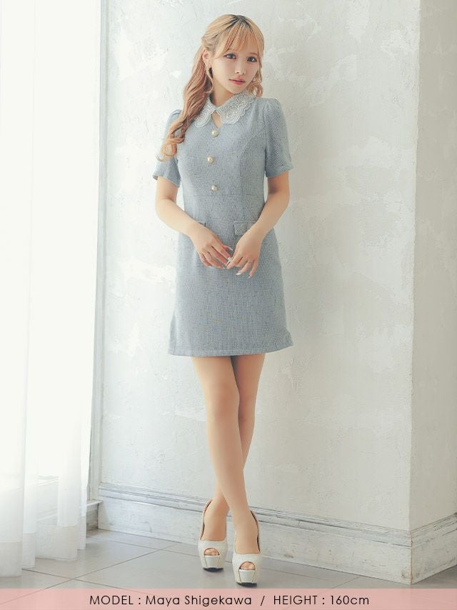 5. 半袖 レース襟付き パールボタン ツイード 胸元カバー フレアミニドレス (Sサイズ~XLサイズ) (重川茉弥/キャバドレス着用)