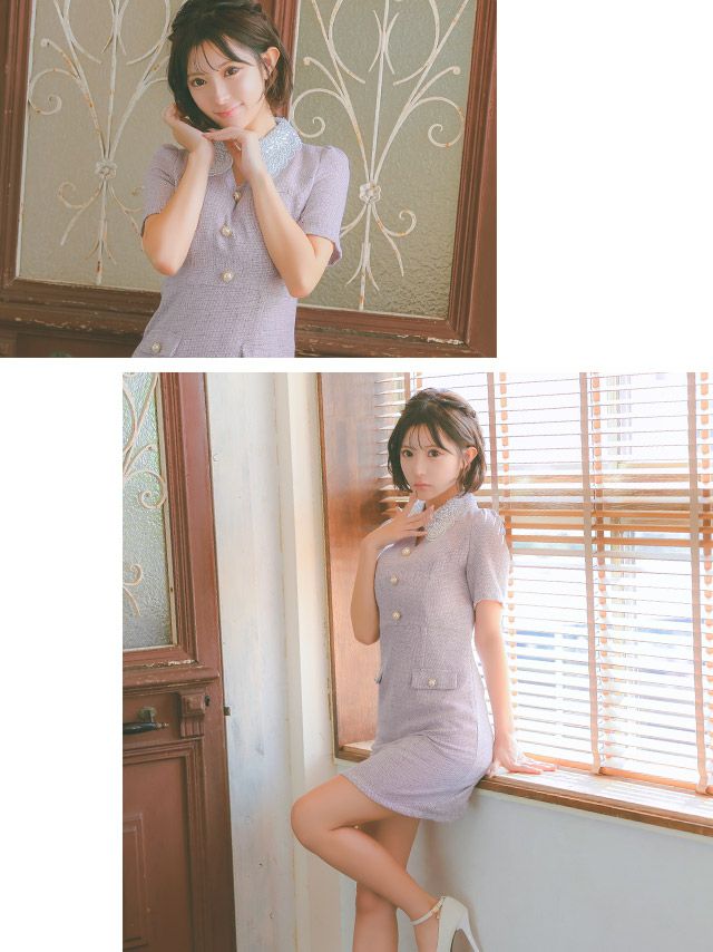 3. 半袖 レース襟付き パールボタン ツイード 胸元カバー フレアミニドレス (Sサイズ~XLサイズ) (重川茉弥/キャバドレス着用)