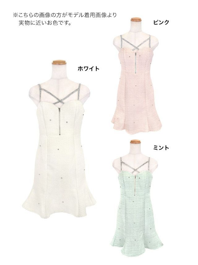 グリッターラメキャミソールバストジップクロスネックツイードミックスビジューフレアミニドレスのカラーバリエーション