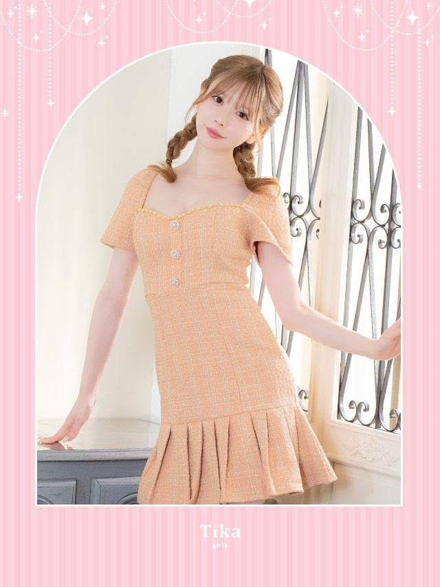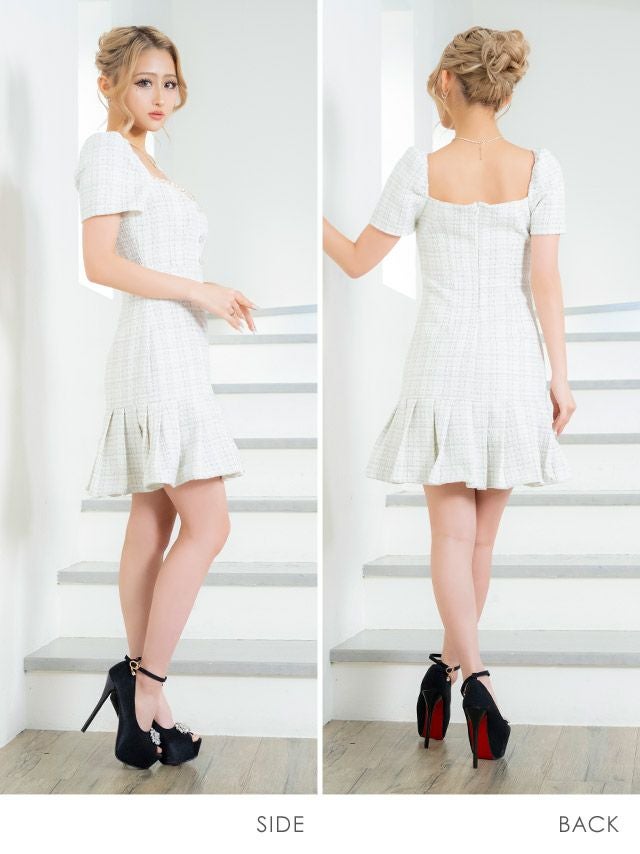 同伴やアフターにもおすすめ♪ [SALE] 半袖スイートハットネックチェーンデザインツイードチェック柄プリーツフレアミニドレス (Sサイズ~XLサイズ) (若林萌々/キャバドレス着用)
