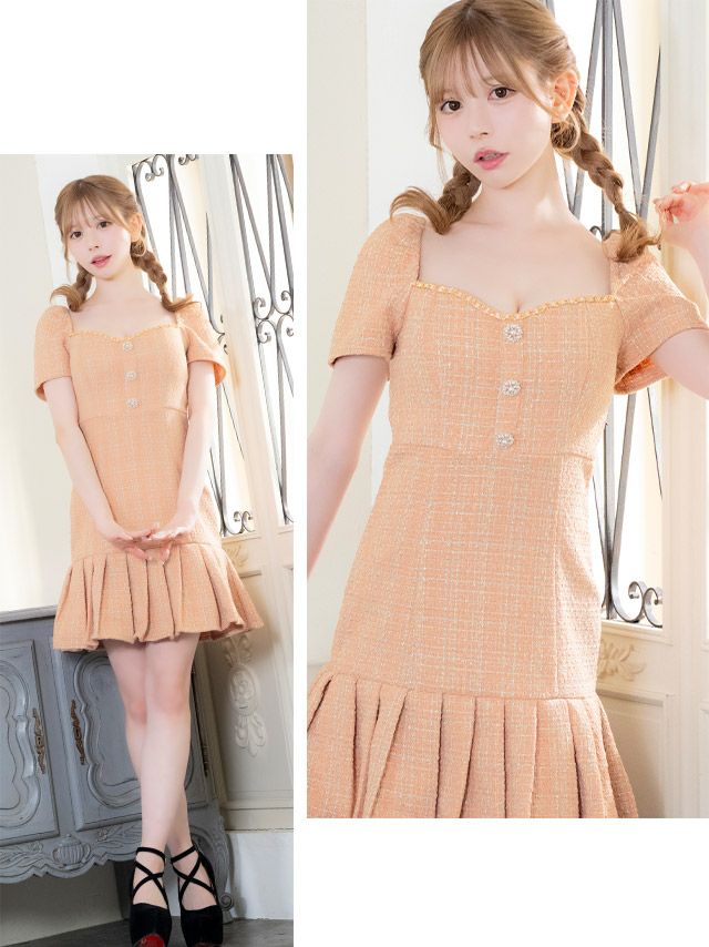 3. [SALE] 半袖スイートハットネックチェーンデザインツイードチェック柄プリーツフレアミニドレス (Sサイズ~XLサイズ) (若林萌々/キャバドレス着用)