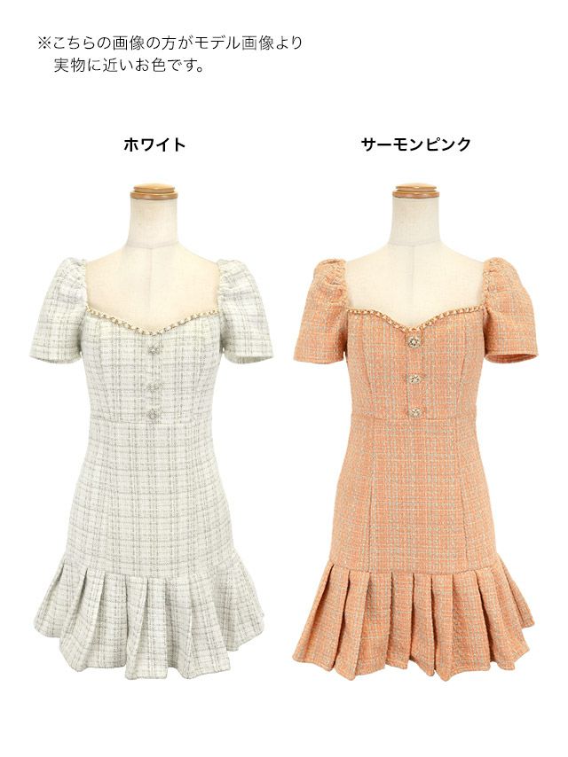 半袖スイートハットネックチェーンデザインツイードチェック柄プリーツフレアミニドレスのカラーバリエーション
