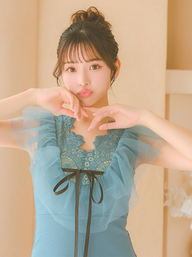 SWEETなお顔周りを演出♡ [SALE] レース ノースリーブ ボリュームチュールフリル リボン ストレッチ タイトミニドレス (Sサイズ~Lサイズ) (上ノ堀結愛/キャバドレス着用)