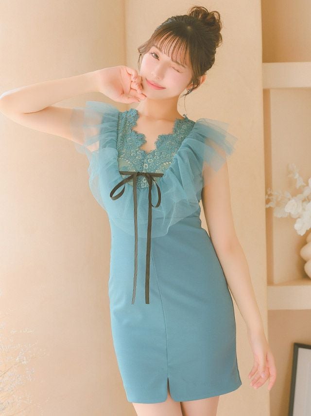 3. [SALE] レース ノースリーブ ボリュームチュールフリル リボン ストレッチ タイトミニドレス (Sサイズ~Lサイズ) (上ノ堀結愛/キャバドレス着用)