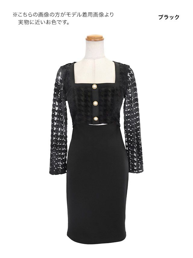さりげなく肌見せ&スタイルアップを実現♪ タイト 膝丈ドレス 長袖 大人 上品 ストレッチ ウエストカットブラジャーのまま スクエアネック パールボタン キャバドレス (せいせい着用)