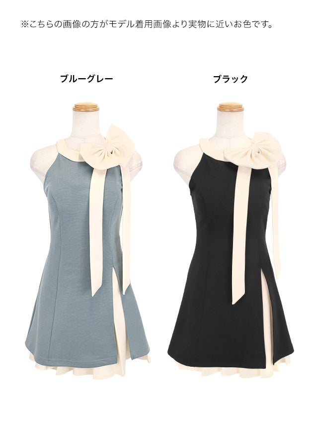 ミニドレス アメリカンスリーブ ハイネック ネックリボン ワンピース ストレッチ Aライン バイカラー プリーツ 同伴 胸元カバー XL ブルーグレー キャバドレスのカラーバリエーション