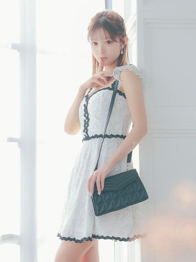 キャミソールモノトーンフェミニン刺繍フレアミニドレスのサイドバッグ全身
