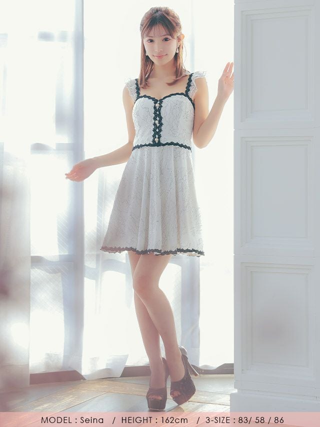 4. キャミソールモノトーンフェミニン刺繍フレアミニドレス (Sサイズ~XXLサイズ) (聖菜/キャバドレス着用)