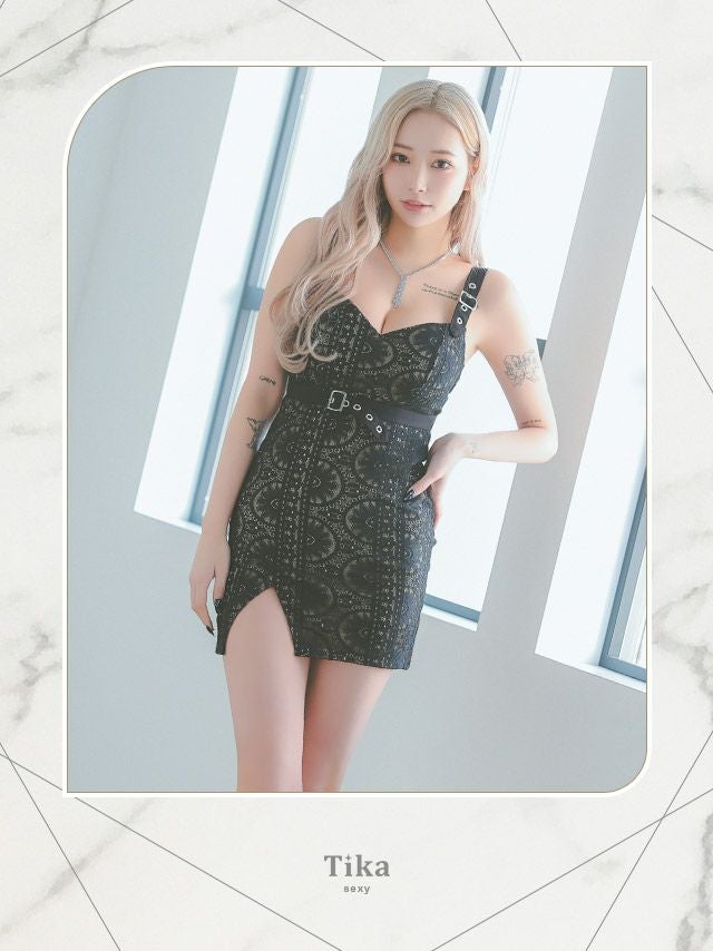 4. キャミソールウエストベルトヌーディーレースストレッチマイクロタイトミニドレス (Sサイズ~Lサイズ) (みゆう/キャバドレス着用)