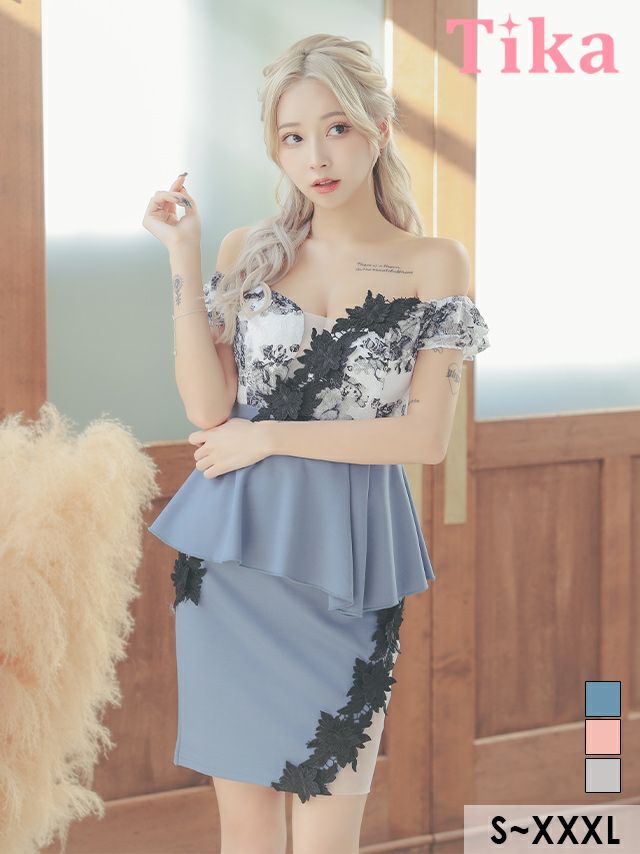 キャバドレス ミニ丈 大きいサイズ 体型カバー キャバクラ Tika ティカ オフショルダーフラワー刺繍レースペプラムタイトミニドレス