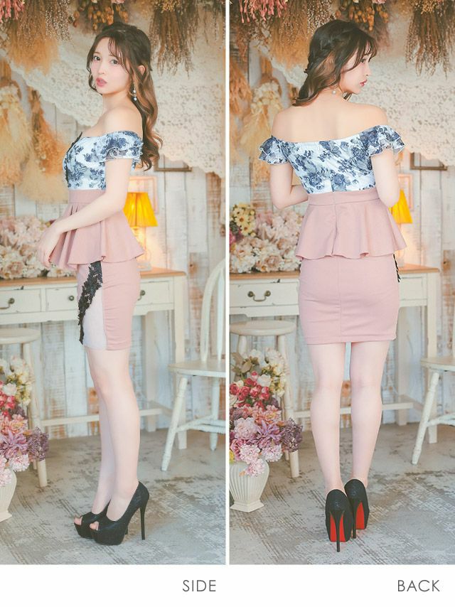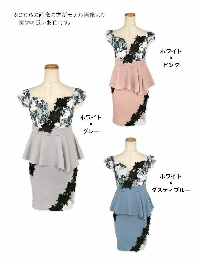 オフショルダー 立体フラワーレース ペプラム バストシースルー 谷間魅せ タイトミニドレスのカラーバリエーション