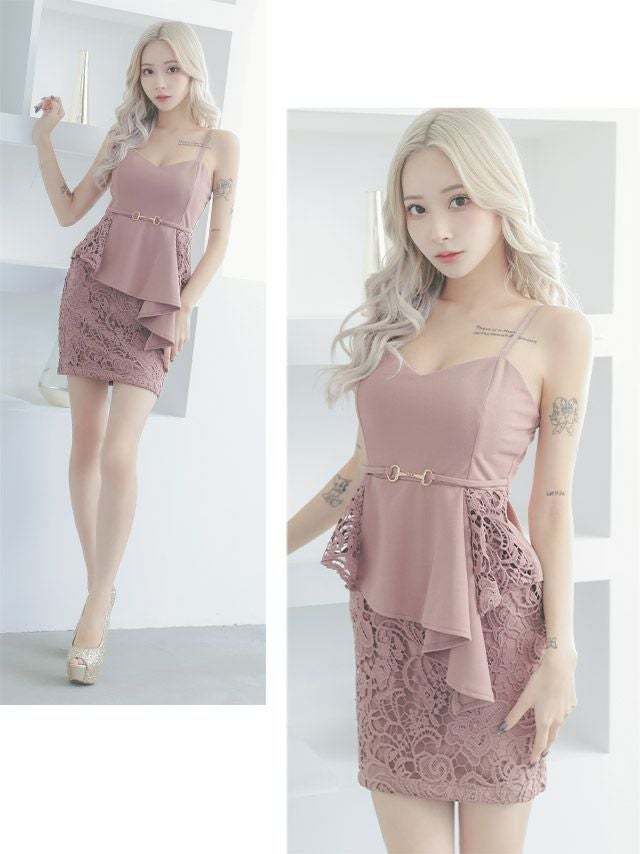 4. セクシー キャミソール アシメ ペプラム ベルト切り替え ケミカルフラワーレース タイトミニドレス (Sサイズ~XXXLサイズ) (一条響/キャバドレス着用)