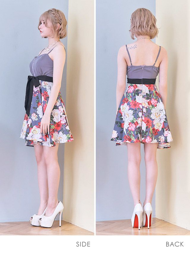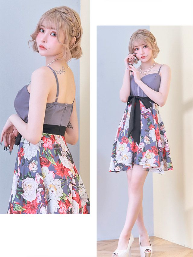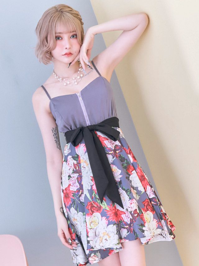 4. バストジップ キャミソール ウエストリボン ボタニカルプリント フレアミニドレス (Sサイズ~XXXLサイズ) (戦慄かなの/キャバドレス着用)