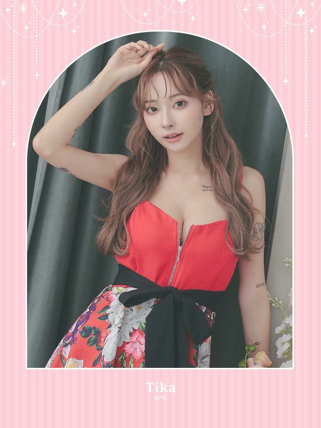 キャバドレス ミニ丈 大きいサイズ Aライン キャバクラ ワンピース Tika ティカ バストジップキャミソールウエストリボン切り替えボタニカルプリントフレアミニドレス