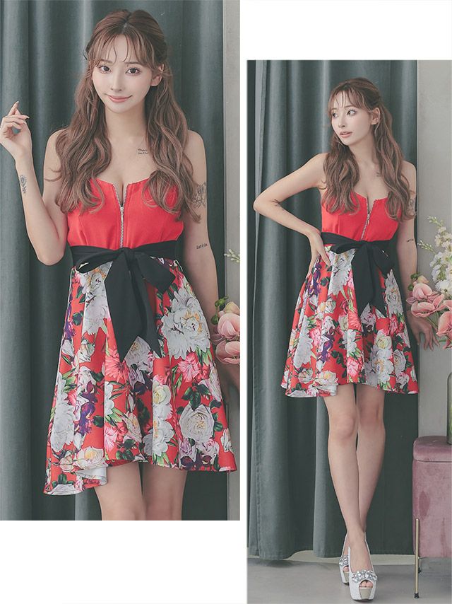 店内の誰よりも華やかに目立てる♪ バストジップ キャミソール ウエストリボン ボタニカルプリント フレアミニドレス (Sサイズ~XXXLサイズ) (戦慄かなの/キャバドレス着用)