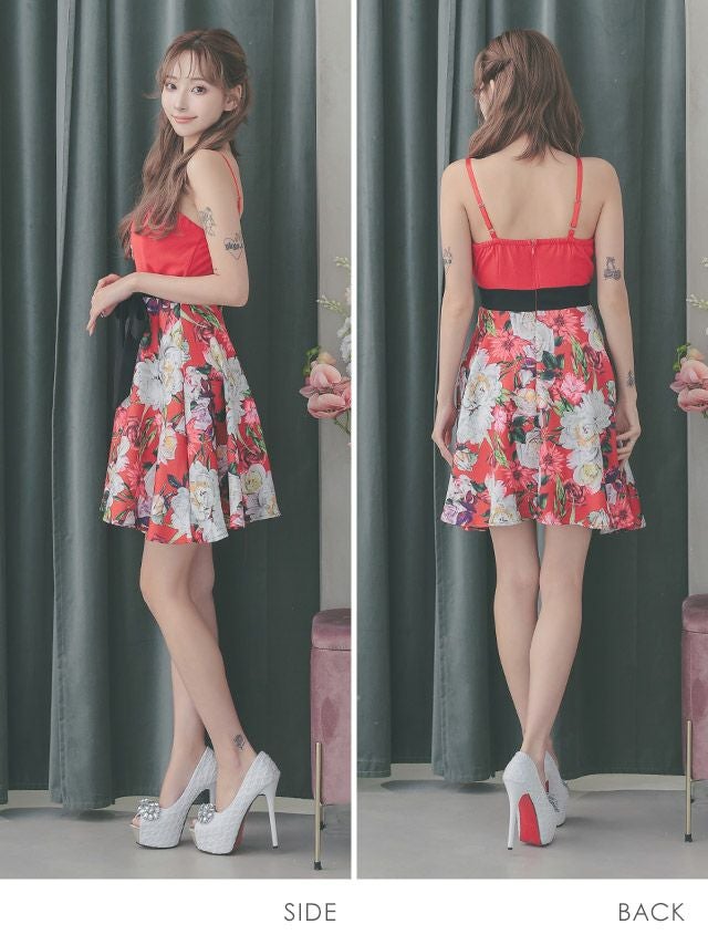 5. バストジップ キャミソール ウエストリボン ボタニカルプリント フレアミニドレス (Sサイズ~XXXLサイズ) (戦慄かなの/キャバドレス着用)