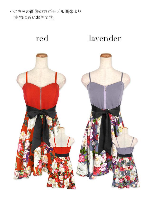 バストジップキャミソールウエストリボン切り替えボタニカルプリントフレアミニドレスのカラーバリエーション