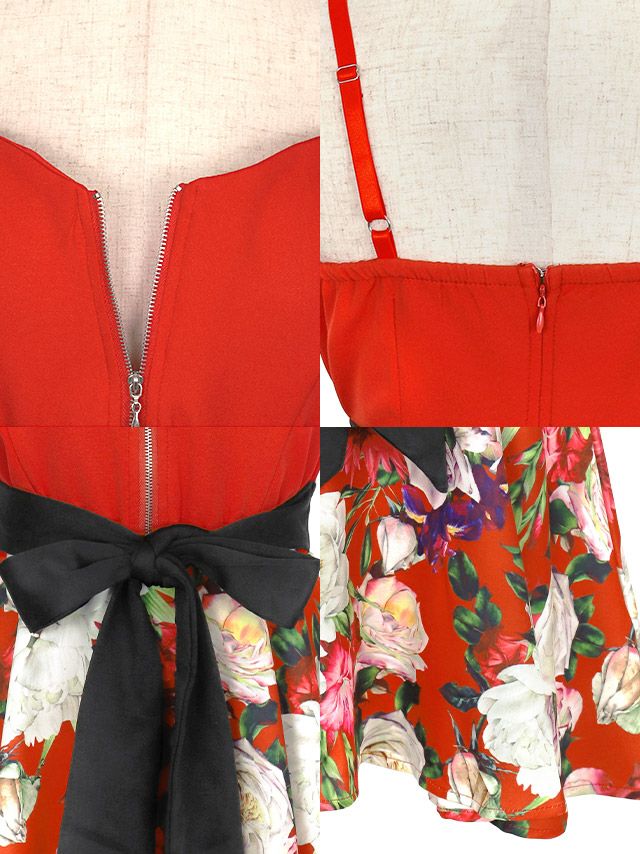 バストジップキャミソールウエストリボン切り替えボタニカルプリントフレアミニドレスの商品特徴