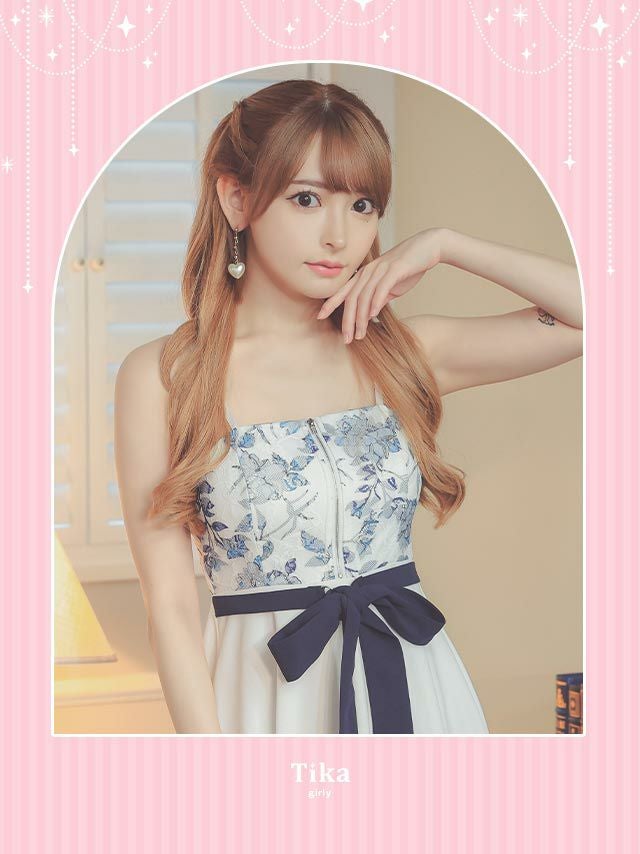 キャバドレス ミニ丈 Aライン ワンピース 大きいサイズ Tika ティカ フェミニンフラワーレースキャミソールジップウエストベリボン付きフレアミニドレス