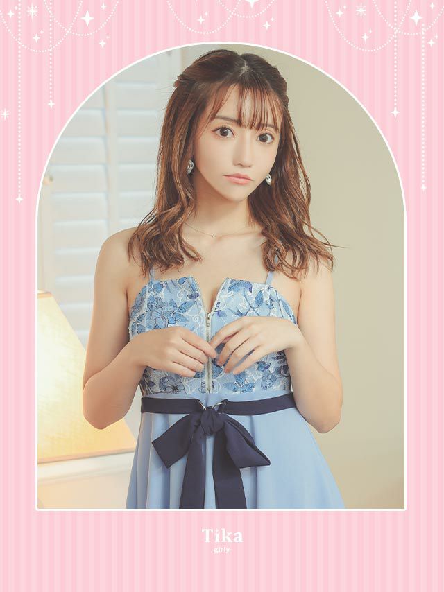 キャバドレス ミニ丈 Aライン 大きいサイズ Tika ティカ フロントジップフラワーレースキャミソール切り替えウエストベリボンフレアミニドレス
