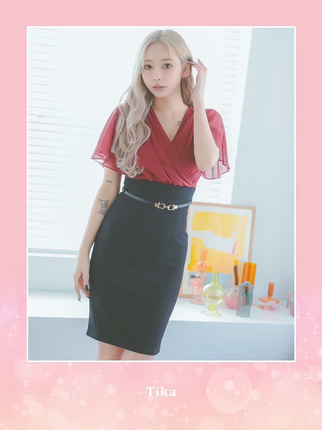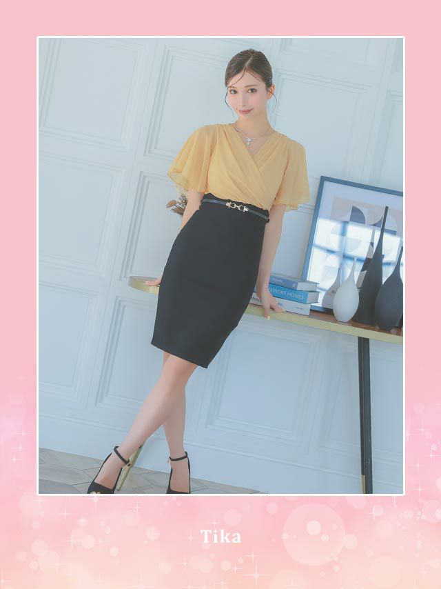 3. 半袖シフォンカシュクールウエストベルトタイト膝丈ドレス (Sサイズ~XXXLサイズ) (みゆう/キャバドレス着用)