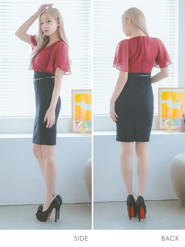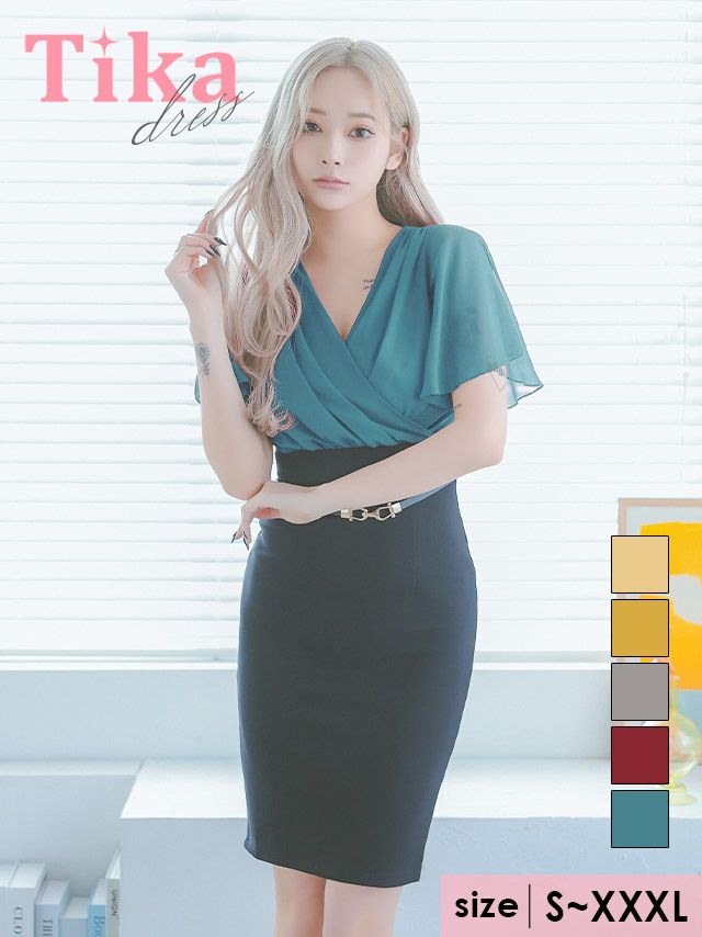 5. 半袖シフォンカシュクールウエストベルトタイト膝丈ドレス (Sサイズ~XXXLサイズ) (みゆう/キャバドレス着用)