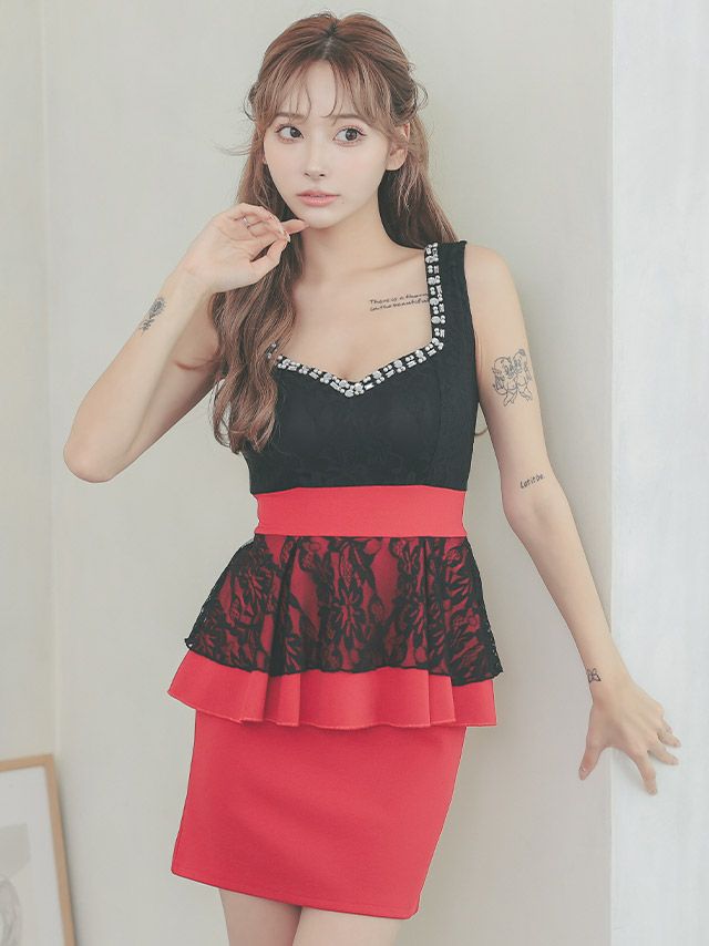 キラキラビジュー付きノースリーブブラックレースウエストリボンペプラム切り替えストレッチタイトミニドレスのカラーバリエーション