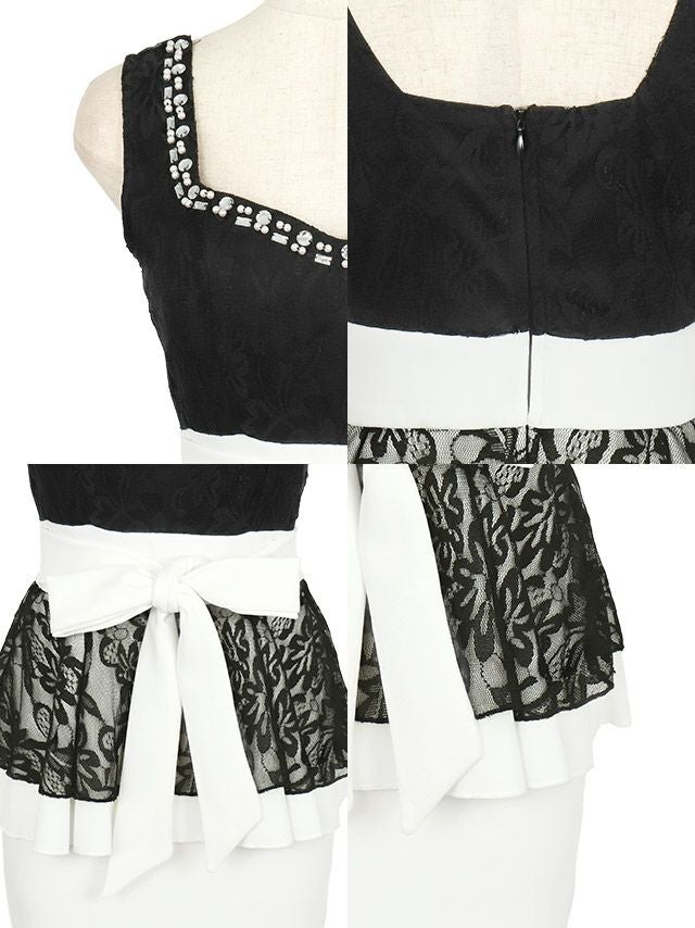 キラキラビジュー付きノースリーブブラックレースウエストリボンペプラム切り替えストレッチタイトミニドレス