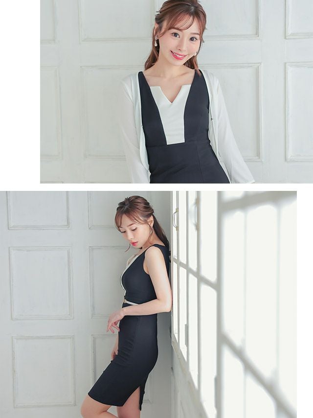 5. ベルト付きノースリーブネックバイカラータイトミニドレス (Sサイズ~XXLサイズ) (久保七瀬/キャバドレス着用)