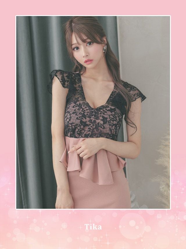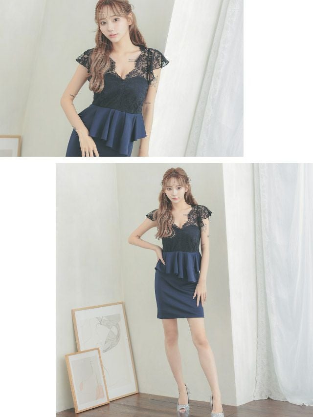 5. フリル袖スカラップブラックレースペプラム切り替え半袖ストレッチタイトミニドレス (Sサイズ~XXLサイズ) (めぐりっぷ/キャバドレス着用)