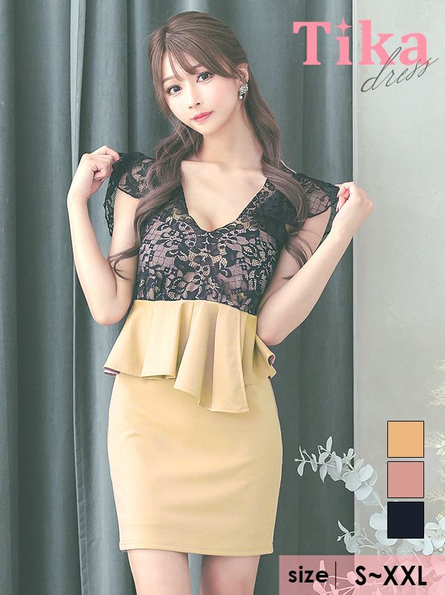 キャバドレス ミニ丈 大きいサイズ 袖あり 体型カバー Tika ティカ 半袖スカラップブラックレースペプラム切り替えストレッチタイトミニドレス
