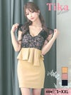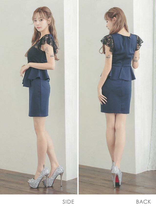 フリル袖ブラックレース切替アシメペプラム半袖タイトミニドレス (Sサイズ~XXLサイズ) (めぐりっぷ/キャバドレス着用)
