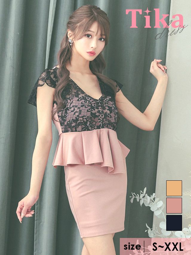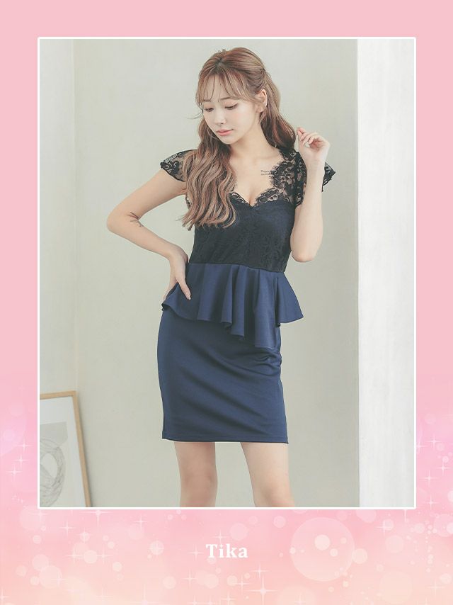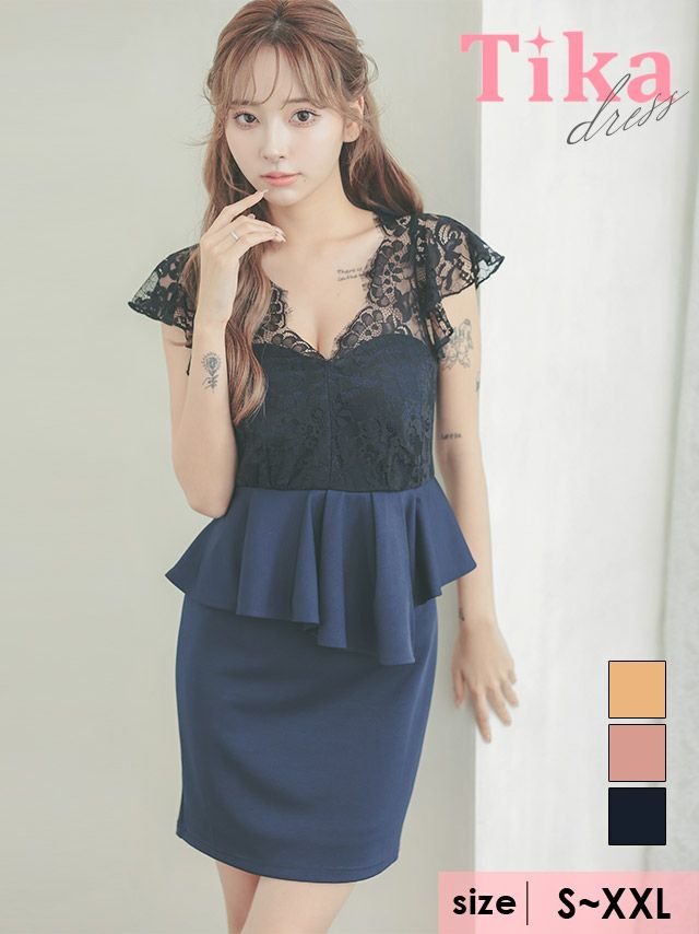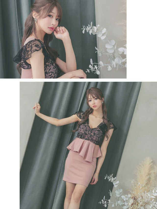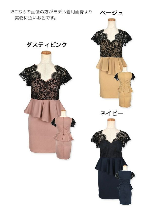 フリル袖ブラックレース切替アシメペプラム半袖タイトミニドレスのカラーバリエーション