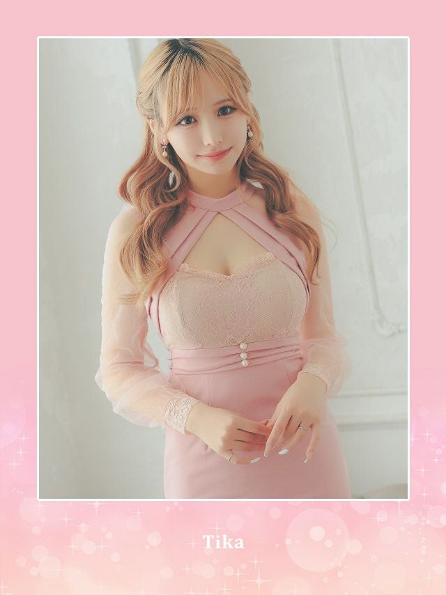 5. シアー 長袖 袖あり バストカット レース切り替え サイド 谷間魅せ タイトミニドレス (Sサイズ~XLサイズ) (重川茉弥/キャバドレス着用)