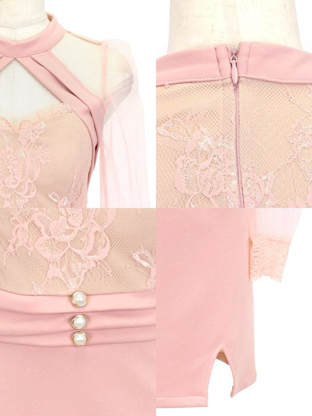 シアー長袖バストカットレース切り替えサイドスリットタイトミニドレスの商品詳細画像1