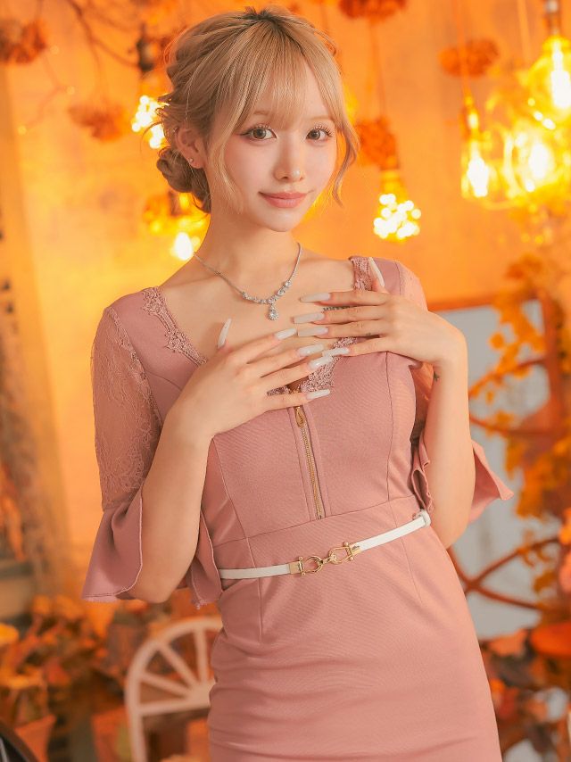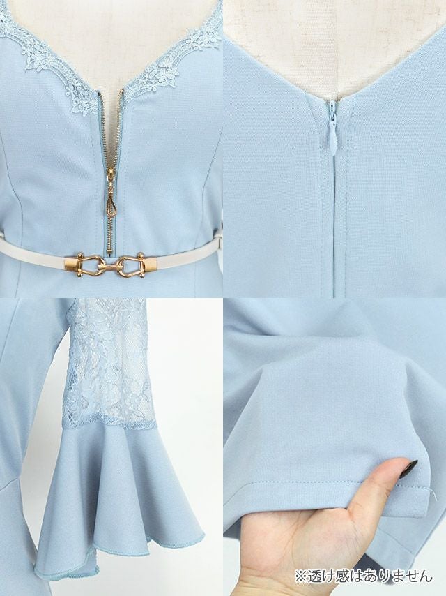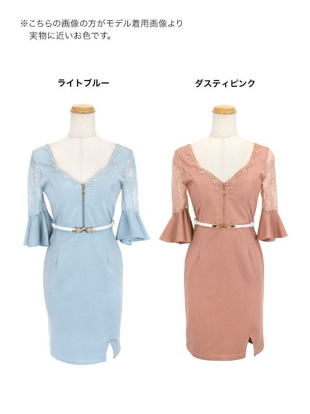 手元を美しく華やかに演出♪ タイト ミニドレス 谷間 ジップ レース 上品 ストレッチ 袖あり 七分袖 ウエストベルト付き ブラジャーのまま ベルスリーブ (重川茉弥着用)