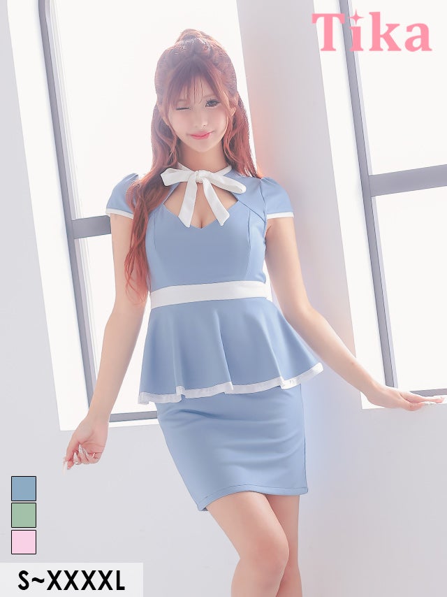 3/13新作★女の子らしいメリハリボディに♡ ミニドレス タイト 谷間 大きいサイズ ストレッチ 半袖 ペプラム ネックリボン ブラジャーのまま パイピング バストカット ピンク XL XXL 4L 5L 6L キャバドレス (若林萌々着用) 【tk-md1283-hc】