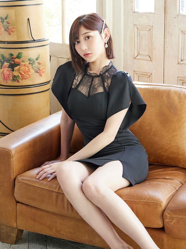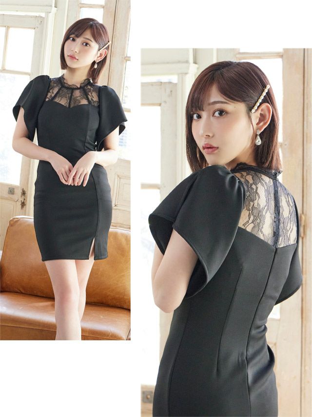 4. ハイネックフラワーレース切替半袖ペタルスリーブサイドタイトミニドレス (Sサイズ~XLサイズ) (志田愛佳/キャバドレス着用)