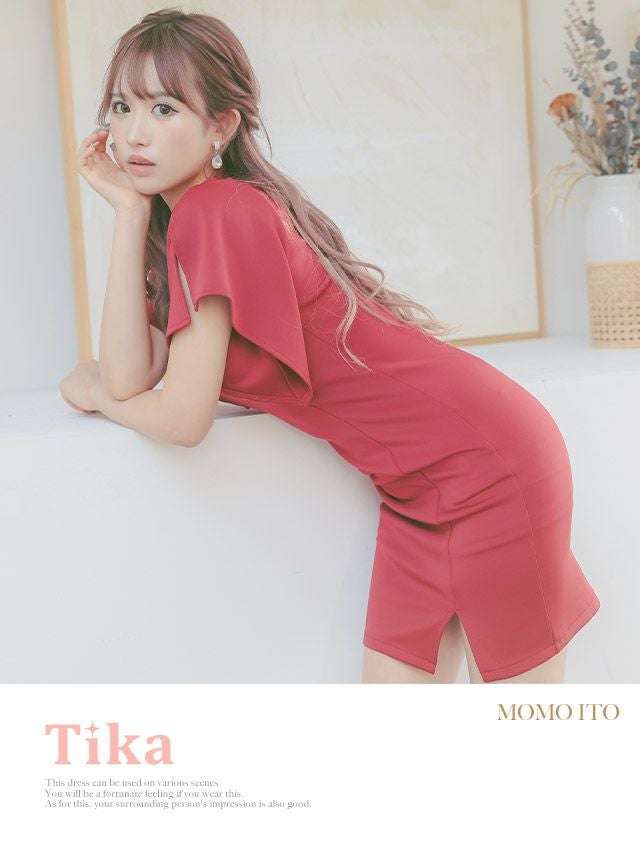 キャバドレス ミニ丈 大きいサイズ キャバクラ 袖あり Tika ティカ ハイネックフラワーレース切替半袖ペタルスリーブサイドスリットタイトミニドレス